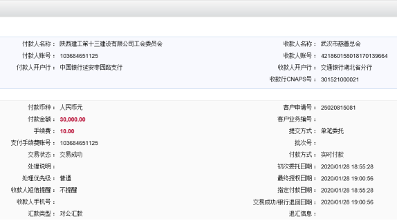 面對新型冠狀病毒肺炎疫情防控的嚴峻形勢,公司第一時間發(fā)出了“愛心捐款倡議書”,立即得到了全體干部職工的積極響應(yīng)。十三建公司全體黨員以及廣大職工發(fā)揮模范帶頭作用,集十三建人力量,匯廣大職工愛心,在短短一天時間內(nèi),自發(fā)捐款合計三萬元,最終通過公司統(tǒng)一轉(zhuǎn)往武漢市慈善總會,助力打贏疫情防控阻擊戰(zhàn),用實際行動支援湖北,向偉大祖國表白!