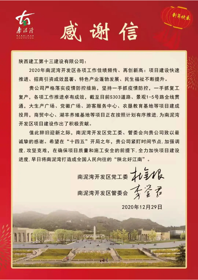 近日,陜建十三建公司收到了來自南泥灣開發(fā)區(qū)黨工委、南泥灣開發(fā)區(qū)管委會(huì)發(fā)來的感謝信。
