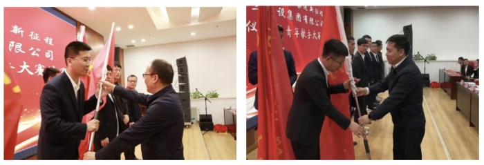 在“師帶徒”活動(dòng)啟動(dòng)儀式上,來(lái)自集團(tuán)機(jī)關(guān)部門(mén)、各基層單位的13對(duì)師徒進(jìn)行結(jié)對(duì),舉行了拜師儀式,并簽訂了“師帶徒”協(xié)議書(shū)。師父代表鄧濤、湯勇,徒弟代表張漢武、李竹鳳分別進(jìn)行表態(tài)發(fā)言。同時(shí),儀式上,集團(tuán)總工程師王弘起、副總經(jīng)理?xiàng)钣篮攴謩e為工人先鋒號(hào)、青年突擊隊(duì)授旗。