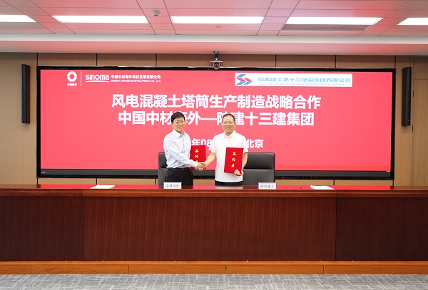 8月1日,集團與中國中材海外科技發(fā)展有限公司在北京就風電混凝土塔筒生產制造簽訂戰(zhàn)略合作協(xié)議并簽訂陜西榆林定邊項目混凝土塔筒預制管片采購合同。中國中材海外科技發(fā)展有限公司黨委書記、執(zhí)行董事高超,集團黨委書記、董事長卜國平代表雙方簽約并致辭。